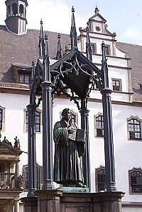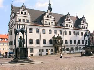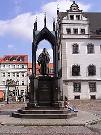 ![]() Der Wittenberger Markt mit Renaissance-Rathaus und den Denkmälern von Luther und Melanchthon |